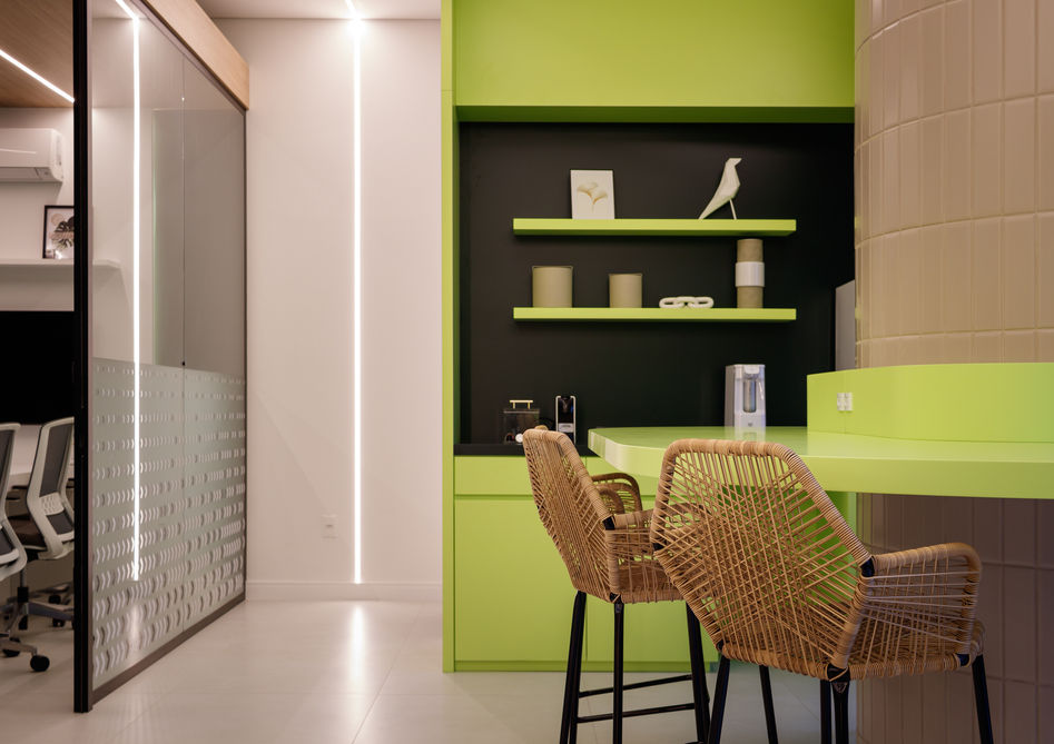 Um espaço amplo, integrado e permeável, que tornou o escritório de assessoria de investimentos parceiro do Banco BTG Pactual, impactante e contemporâneo. Os espaços de trabalho se integram com a aréa de vivencia dal design autoral e das cores neon.